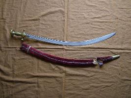 | Description / विवरण | Sword which blade is made of stainless steel and it is narrower towards tip also it is curved shaped. Alamgiri hilt made of brass which is having floral design. Scabbard made of wood and covered with red coloured velvet cloth. |