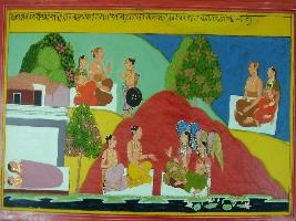 | Description / विवरण | Miniature painting based on Mahabharat - Adi parva depicting Hidimba and Bhim spending time together. One scene depicts Ghatotkach standing in front of Bhim and Hidimba. |