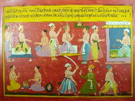| Description / विवरण | Miniature painting based on Mahabharat - Udyam parva. The painting depicts king Bindura telling his son about the duties of the king which are like donation to Brahman, doning yagna, to fight against wicked people. |