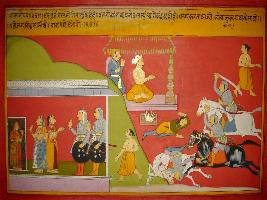 | Description / विवरण | Miniature painting based on Prithviraj Raso depicting Chandpundir and Sanjogita on the right lower corner, while in the centre king performing yagna and on its left a war scene is depicted. |