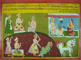 | Description / विवरण | Miniature painting based on Mahabharat - Udyam parva. The painting depicts Krishna is coming to meet Kunti and inform her about the Kauravas, then Kunti sent message with Krishna to Yudhisthir that whatever he will do should not be above of Dharama. |