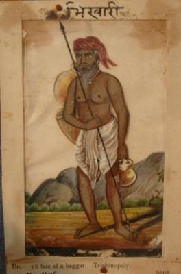 | Description / विवरण | Miniature painting on mica, based on the tale of a beggar. The painting depict a beggar in standing position holding a pot in his left hand and a spear in right hand. |