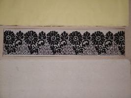 | Description / विवरण | Specimen of Nottingham machine made lace, locally called Black silk Guipure made with silk thread and designed with big floral work with leaves and five small flowers also designed on it. The upper portion is in a net with vertical small dotes. |