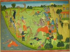 | Description / विवरण | Miniature painting based on Gajendramoksha depicting Vishnu coming to save an elephant from a crocodile who caught the elephant. |
