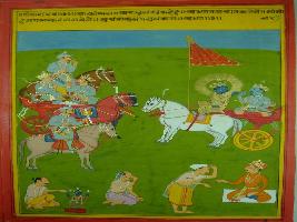 | Description / विवरण | Miniature painting based on Shri Bhagwat Gita. Arjun and Krishna where Krishna says that anybody should do his duty and Arjun s duty is fighting so Krishna asked Arjun to fight. |
