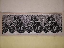 | Description / विवरण | Specimen of Nottingham machine made lace, locally called Black silk Guipure made with silk thread and designs with four big flowers and three small flowers with leaves. The upper portion is net base with checked pattern with dots on it. |