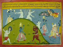 | Description / विवरण | Miniature painting based on Mahabharat - Udyam parva depicting Vidur is telling Duryodhan that he can t trap Krishna. It are sixteen thousands demons who could not defeat him and in his childhood he killed many demons and two great man. So it is imposible for Duryodhan to trap Krishna. |