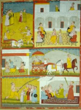 | Description / विवरण | Miniature painting based on Bhagwat Purana depicting Akrura taking Krishna along with him to Mathura. |