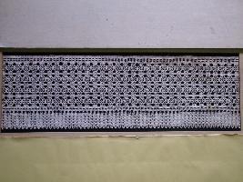 | Description / विवरण | Specimen of Nottingham machine made lace, locally called Tatting Lace , with geometrical rectangular pattern and floral designs used on it. The upper margin border is designed with small rectangular boxes and the bottom is designed with long patterns. |