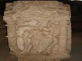 | Description / विवरण | A sculptured architectural fragment of a pillar depicting a chanwari bearer standing in niche holding tussle with right hand and left hand holding a chanwari. Her face is rubbed off. She is wearing necklace and garland. Both the sides having floral design. |