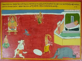 | Description / विवरण | Miniature painting based on Mahabharat - Virat parva depicting Pandavas are praying Bhavani on their way to Virat who took birth in the house of Nanda, then flee to earth while Kansa wants to kill her. She is sitting on the throne in the sky. |