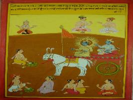 | Description / विवरण | Miniature painting based on Shri Bhagwat Gita. It depicts Krishna preaching Arjun that the man who does not think about him he his fool and stupid while everybody should think about Krishna for their salvation. |