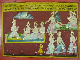 | Description / विवरण | Miniature painting based on Mahabharat - Udyam parva depicting Sarthiki told in the court of the Kauravas that they can not trap Krishna who has come as a messager of Pandavas as it goes against the ethics of war. |