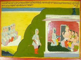 | Description / विवरण | Miniature painting based on Mahabharat - Gada parva. The painting depicts that Krishna is taking with Dhritrashtra and Gandhari while Pandavas one seen in sitting postion in the other side. Krishna says to Gandhari that an 1st elder mother she should welcome the Pandavas. |