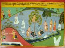 | Description / विवरण | Miniature painting based on Mahabharat - Virat parva depicting Pandavas is putting their bows and arrow and tying it together. At the middle part of painting. At the upper and lower right part, one of Pandavas is depicting fighting with enemy with their weapon. This is tell the greatness of their weapons. |