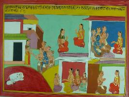 | Description / विवरण | Miniature painting based on Mahabharat - Adi parva depicting Pandavas while in exile one day going to beg in one a Brahmans, house the upper right Pandavas giving this bhiksha to Kunti, the lower part depicts son of a Brahman talking to his parents. |
