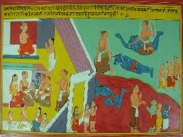 | Description / विवरण | Miniature painting based on Mahabharat - Adi parva depicting killing of Bakasur Demon by Bhim. Inside the palace Pandavas are depicted. |
