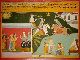 | Description / विवरण | Miniature painting based on Prithviraj Raso depicting a scene in which Salash Pawar talking to Sanjogita about their bravery and loyalty to Prithviraj at the lower right side. Two warrior are fighting on horses at the upper left side while a female monk is preaching to two seated women at lower left. |
