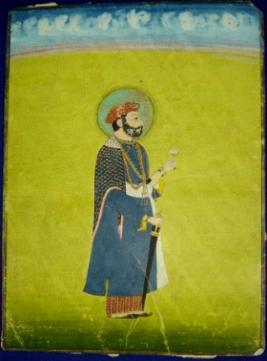 | Description / विवरण | full size portrait of a king Bhaktawar Singh in standing position facing left holding a flower in left hand and a sword in right hand. He is wearing a turban and a jama. A halo is seen behind his head. |