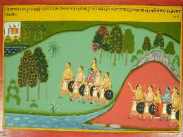 | Description / विवरण | Miniature painting based on Mahabharat - Virat parva depicting Draupadi is telling Pandavas that this place is probably capital of Virat nagar. Yudistra asked Arjun to carry Draupadi on his shoulder. |