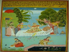 | Description / विवरण | Miniature painting based on Rasikpriya depicting Radha sitting on the bed and preparing to meet her lover under the moonlit night. Her friends are adorning her, decorating the bed, preparing sandalwood paste, warming up fire and serving her as excitedly as she is. |