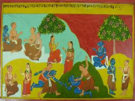 | Description / विवरण | Miniature painting based on Mahabharat - Adi parva depicting fight between Bhim and Hidimb and Bhim killing him. |