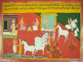 | Description / विवरण | Miniature painting based on Mahabharat - Udyam parva. A king is depicted sitting, two Brahmans are depicted performing yagna, two Brahman are depicted with horses and some Brahmans are depicted riding horses. |