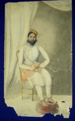 | Description / विवरण | Miniature painting of full size portrait of Raja Bhaktawar Singh depicted sitting on chair. He is wearing a cap and his hands are resting on his thighs and feet are resting on stool. |