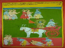 | Description / विवरण | Miniature painting based on Shri Bhagwat Gita. On the painting Arjun asking Krishna about the motivation that compel man to commit sin. On the painting Arjun and Krishna are depicted with other Pandavas. |