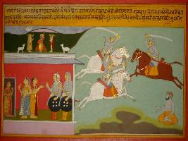 | Description / विवरण | Miniature painting based on Prithviraj Raso depicting Krishna lifting Govardhan mountain on his little finger. Below of it Sanjogita listening to Pawar. Two white horses are fighting with a brown horse and a yogi is depicted sitting below. |