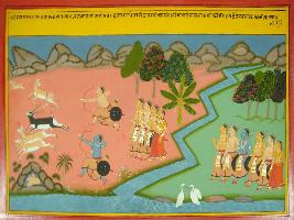 | Description / विवरण | Miniature painting based on Mahabharat - Virat parva depicting Pandavas with Draupadi came near bank of river Yamuna at the left part. Arjun and one other Pandavas brother are shown hunting deer and stag with their arrow. |