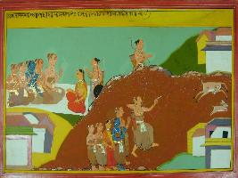 | Description / विवरण | Miniature painting based on Mahabharat - Adi parva depicting on the upper right Pandavas talking to Draupadi and lower part depict they hunting a deer. |