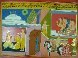 | Description / विवरण | Miniature painting based on Mahabharat - Adi parva depicting Dhritdyumna talking to king Dhrupad and ask him to call Yudhisthir to Panchal. Then the Purohit is at the court of Pandavas and gave the message. At the lower left the chariot is waiting to take Yudhisthir. |