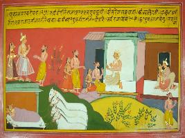 | Description / विवरण | Miniature painting based on Mahabharat - Udyam parva depicting Patardan becoming father that time Galva come and took away the girl, then Madhavi and Galva come to Usinar. |