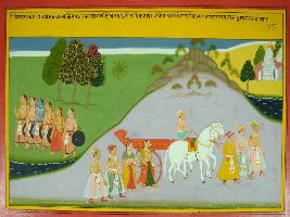 | Description / विवरण | Miniature painting based on Mahabharat - Virat parva depicting Pandavas with Draupari travelling in forest and going near bank of Yamuna river. Indra sent his chariot with rider, soldier and women to Panchal kingdom to bring Pandavas. |
