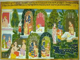| Description / विवरण | Miniature painting based on Geet Govind depicting a scene in which love between a common man and a woman at the right hand side. While at the left side showing Krishna and Radha s loving scenes. |