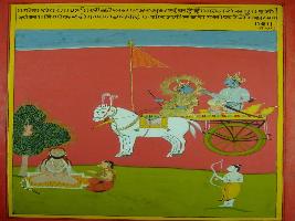 | Description / विवरण | Miniature painting based on Shri Bhagwat Gita. It depicts Krishna preaching Arjun that Kama is enemy of gyan. So try to avoid it. This can be done by taking Vairagya. |