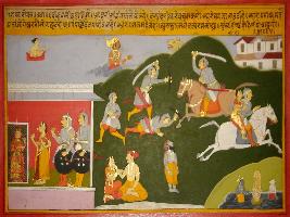 | Description / विवरण | Miniature painting based on Prithviraj Raso depicting Narasimha Dimo, the horse taking Prithviraj and Sanjogita to Delhi as Prithviraj eloping with Sanjogita. The painting also depicts the horse praising his power himself. At the lower left corner Samudra manthan is depicted. |