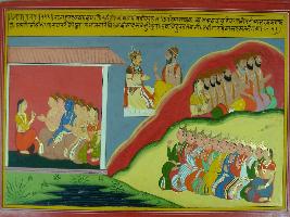 | Description / विवरण | Miniature painting based on Mahabharat - Adi parva depicting Dhrupad saying to Pandavas that Draupadi can marry only one of them. In the mean time Vyas appeared and he said that Draupadi should marry all of them. Then he started telling the story of Gautami who got married to seven sages. But then also Dhrupad didn t agree and Vyas take him to soldier. |