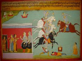 | Description / विवरण | Miniature painting based on Prithviraj Raso depicting Salaka Kumar and Sanjogita on the right side of painting while on the left hand side a battle scene is depicted. |