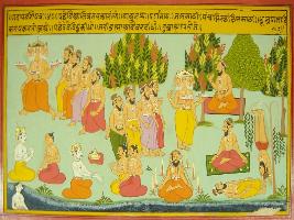 | Description / विवरण | Miniature painting based on Mahabharat - Gada parva depicting Vishvamitra isperforming tough penance and Brahma arrives to him to bestow his blessings. |