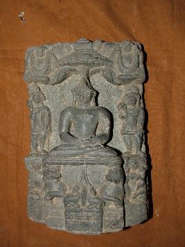 | Description / विवरण | A Jain tirthankar is sitting in padmasan on a lion throne. Two persons are holding chauri on either side of the Tirthankar . Besides these a mother and child, human figure male is depicted below the throne. At the top two garlands are shown. Umbrella is carved above his head. Face is partly broken. |