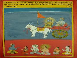 | Description / विवरण | Miniature painting based on Shri Bhagwat Gita. It depicts Krishna preaching Arjun that sages can control their senses. Sinner papi is controlled by Kama. Gyan knowledge can destroy Agyan Ignorance . |