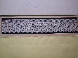 | Description / विवरण | The lace is divided into three section, the upper portion has been worked in criss-cross manner. The middle portion carries circular shaped with floral designs and the final portion carries mango shaped leaves with floral work. It is a machine made lace. |