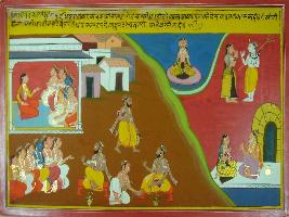 | Description / विवरण | Miniature painting based on Mahabharat - Adi parva depicting Vyas sitting and telling that a daughter of sage doing penance for Shiv. Shiv appeared in front of her and gave her boon. Later this female takes birth as Draupadi. |