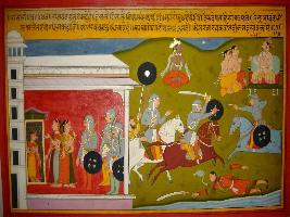 | Description / विवरण | Miniature painting based on Prithviraj Raso depicting Randhir Gujar telling Sanjogita that he is pure kshatriya and in front of him power of Jaichand even cannot do anything. Thus he is trying to convince Sanjogita that they too are as powerful as the army of Jaichand. |