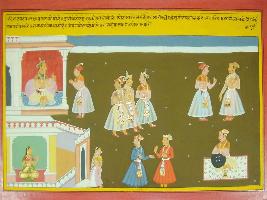 | Description / विवरण | Miniature painting based on Mahabharat - Virat parva depicting inquiring person and getting truth out of him. Queen should not shared their eyes on seeing king going for war. king should fight bravely and performed yagna. |