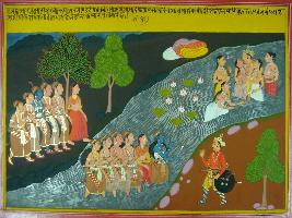 | Description / विवरण | Miniature painting based on Mahabharat - Adi parva depicting the crossing of river Ganga by Pandavas and Draupadi. And Gandharva is giving them a message that he is having a bath with females. |