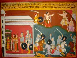 | Description / विवरण | Miniature painting based on Prithviraj Raso depicting Bhoj Chandela requesting Sanjogita to have faith on him and my army and says that he is as powerful as Indra and army of Jaichand will not be able to reach Delhi by defeating them. |