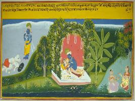 | Description / विवरण | Miniature painting based on Geet Govind depicting Radha with her friend in lower left corner telling her about her loving union with Krishna. In central part, their loving union is depicted. |